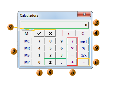 - Memória: Pode ser utilizada para salvar números em um pequeno espaço de armazenamento da calculadora, toda vez que um número estiver na memória, se acenderá um campo com a letra M