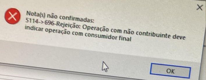 As mensagens "Operação com não contribuinte deve indicar operação com consumidor final" ou ""Operação com contribuinte não deve indicar operação com consumidor final", indicam normalmente um erro de cadastro do cliente, onde a NF foi gerada com (ou sem) uma inscrição estadual, e alterado depois de a NF ter sido lançada.