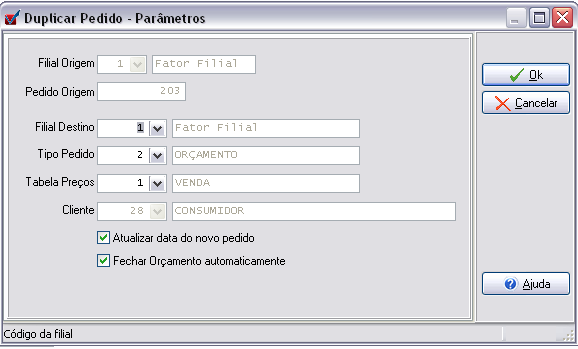 - Deixe a opção Fechar Orçamento automaticamente marcada. Desta forma, o orçamento original será alterado para FC-Fechado após a duplicação. Mesmo que esta opção estiver marcada, não interfere na cópia normal de pedidos, só tem ação sobre pedido de Orçamento.